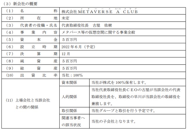 東京通信<7359>は、5月9日、メタバース事業およびデジタルサイネージ事業に参入することと、それぞれの事業を目的とした新会社「株式会社METAVERSE A CLUB(メタバース エース クラブ)」と「株式会社Digital Vision Industries(デジタル ビジョン インダストリーズ)」を6月に設立することを発表した。