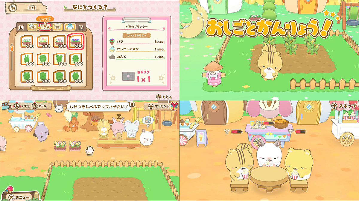 げっし~ずは、 プレイヤーが指示してあげることで、 お仕事をしたりご飯を食べたり、 工作をしたりする。 それぞれ得意不得意があったり、 好き嫌いがあったりするので、 工夫をしてお世話すると、 村づくりが進みる。