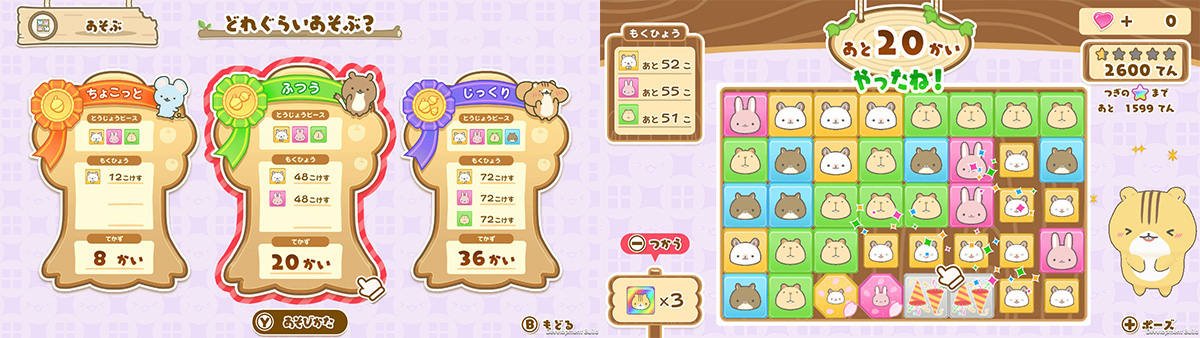 げっし~ずに何かさせるように指示すると、 彼らの活動を待つ 「待ち時間」が必要になる。 その間に、 フィールドに施設を設置したり、 新しいレシピで食べ物を作ったりできるが、 さらに 「パズルゲーム」を遊ぶことで 「しあわせポイント」をゲット利用できる。