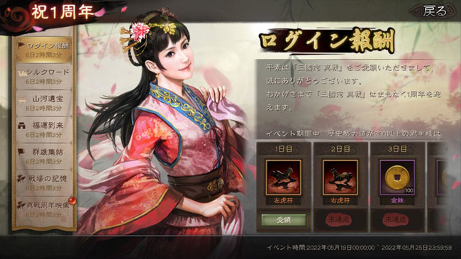 イベント期間中、 歴史勢力値が300以上の君主様はゲームにログインすると、 祝1周年報酬を毎日受け取ることができます。
