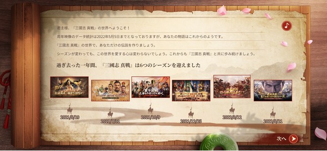 イベント期間中、 君主様はイベント特設ページで自分だけの周年映像を鑑賞することができ、 映像最後の結果ページを共有すると100金銖を獲得できます。