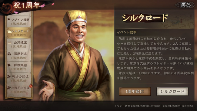 2022年5月19日(木)から5月25日(水)の間、 『三國志 真戦』ゲーム内では七つの1周年記念イベントが開催されます。 どれも豪華な報酬をたくさん用意しておりますので、 ぜひ毎日忘れずに参加してください!
