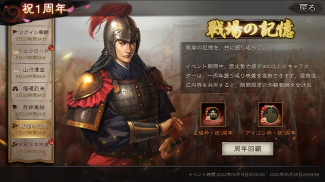 イベント期間中、 歴史勢力値が300以上の君主様は、 1周年振り返り映像を視聴できます。 視聴後に内容を共有すると、 期間限定の外観報酬を受け取れます。