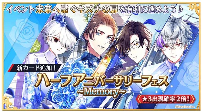 本日からハーフアニバーサリー衣装に身を包んだ★3「【Azure Memory】マークス(CV:熊谷健太郎)」と★3「【Azure Memory】シャスポー(CV:江口拓也)」と★3「【Azure Memory】在坂(CV:植田圭輔)」と★3「【Azure Memory】ファル(CV:前野智昭)」が登場する、 期間限定のピックアップガチャを開催いたします。