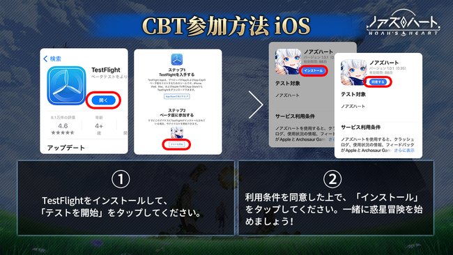 iOS版は、 使用するiOSデバイスに「TestFlight」をインストールする必要がある。 あらかじめAppStoreより「TestFlight」をダウンロード/インストールしよう。 操作手順は下記のイメージ通り。