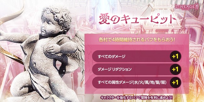 期間中、 アデン大陸の各村に「キューピットの銅像(イベント)」が出現します。銅像に話しかけることで、 「すべてのダメージ +1」「ダメージ リダクション +1」「すべての属性ダメージ(水/火/風/地/闇/聖) +1」のバフを、 4 時間受けることができます。イベントの詳細は公式サイトのお知らせをご確認ください。