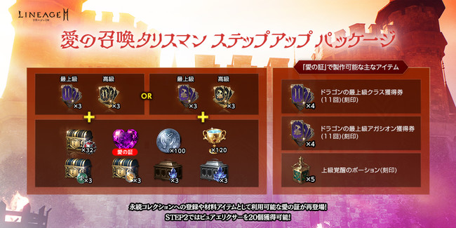 クラスまたはアガシオンの召喚66回分や、 「ドラゴンのタリスマン箱(刻印)」32個、 「熟練度ボーナス コイン」100個などに加え、 復刻した「愛の証(刻印)」1個がセットになった「愛の召喚タリスマン ステップアップ パッケージ」が登場しました。 「愛の証(刻印)」は永久コレクションアイテムとして登録することができ、 製作の材料として「上級覚醒のポーション(刻印)」5個や「ドラゴンの最上級クラス獲得券(11回)(刻印)」4個などを製作することもできます。