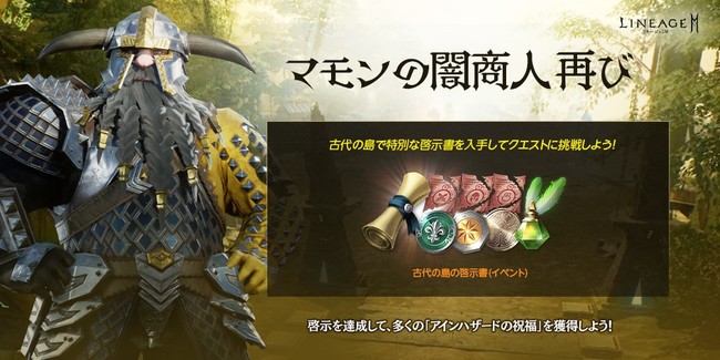 「バナミン(イベント)」から、 アデナを使用することで、 「古代の島」に関連したクエストなどが啓示される、 「古代の島の啓示書(イベント)」を獲得できます。