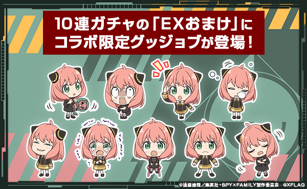 また、 ガチャ「超・獣神祭×『SPY×FAMILY』」で10連ガチャを引くと「EXおまけ」として「アーニャ・フォージャー」の"コラボ限定グッジョブ"が9種類の中からいずれか1種類付いてくる。