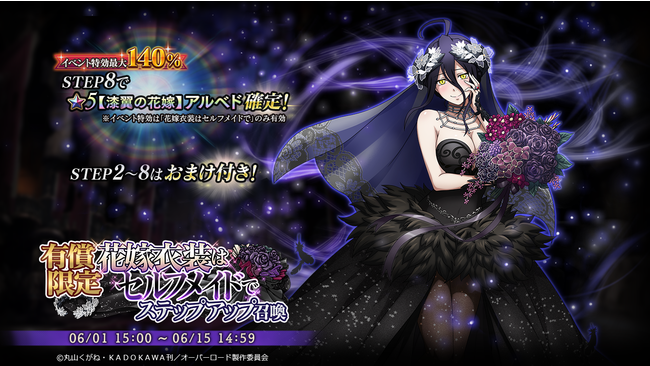 STEPで新登場『【漆翼の花嫁】アルベド』が確定する有償限定召喚!イベント「花嫁衣装はセルフメイドで」では特効最大「140%」を所持しています!