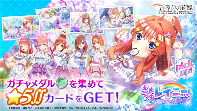 enish<3667>は、『五等分の花嫁 五つ子ちゃんはパズルを五等分できない。』(『ごとぱず』)において、6月3日より、週刊少年マガジン編集部完全監修のゲームオリジナルストーリーをフルボイスで楽しめる新イベント「五つ子ちゃんとあまつゆの中で ~雨に濡れてはいけません!~」を開催する。また、イベントに先駆け5月31日より、五つ子たちの紫陽花園のウワサを探る姿を描き下ろしたイラストのカードが手に入る新しいガチャを開始した。