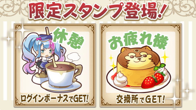 コラボカフェ開催を記念して、 ゲーム内チャットで使用できる2種類の限定スタンプをプレゼント!ログインボーナスやイベント交換所で獲得することができます。