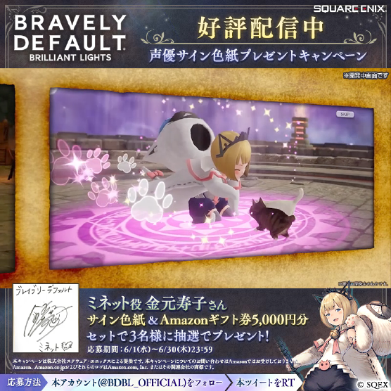 本日6月1日より、公式Twitterにて、ミネットを演じる金元寿子さんのサイン入り色紙とAmazonギフト券(5000円分)がセットで当たるフォロー&リツイートキャンペーンを実施する。