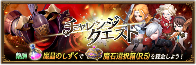 また、「魔石の欠片獲得クエスト」「研磨剤獲得クエスト」のアイテムドロップ量が50%増加する「チャレンジクエスト開催記念キャンペーン」も開催する。
