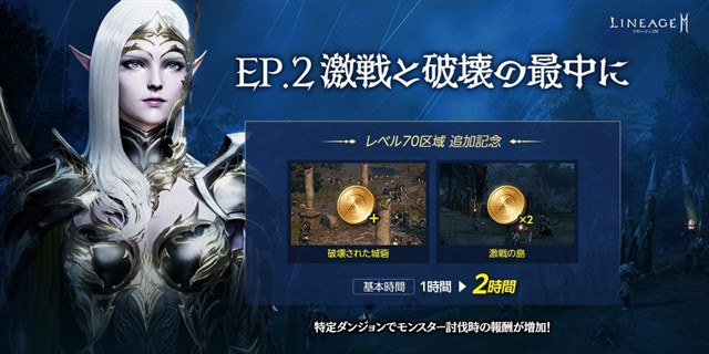 期間中、ダンジョン「激戦の島」と「破壊された城砦」の基本時間が2時間に増加する。さらにモンスターを討伐すると、「破壊された城砦」では通常と異なり、EXPの他にもアデナを獲得できるほか、「激戦の島」では獲得できるアデナが2倍に増加する。イベントの詳細は、公式サイトのお知らせで確認できる。