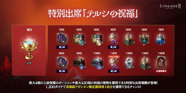 1200ダイヤでオープンすることができる特別な出席報酬が登場した。デイリー報酬として「祝福の聖物」30個のほか、「業火の英雄級アガシオン確定獲得券(1回)(刻印)」や「魔力が宿ったインク(希少)」、「上級覚醒のポーション(刻印)」などのアイテムを獲得できる。特別出席「テルシの祝福」の詳細は、公式サイトのお知らせで確認できる。