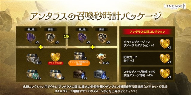 クラスまたはアガシオンの召喚66回分に、「業火の砂時計箱(刻印)」35個、「業火のダンジョン時間補充石選択箱(刻印)」2個、「アンタラスの証(刻印)」1個などがセットになった「アンタラスの召喚砂時計パッケージ」が登場した。「アンタラスの証(刻印)」は永久コレクションアイテムとして、登録することができる。「成長の砂時計」は、使用することで「EXPボーナス」や「すべてのダメージ」「ダメージ リダクション」などのステータスを一定時間向上することができるほか、製作の材料としても使用することができる。「成長の砂時計」を使用して製作できるアイテムは週ごとに異なり、期間限定製作の2週目ラインナップには、「神聖付与スクロール(マーブルの宣告)(刻印)」などの各種神聖付与スクロールのほか、「業火の豪華な伝説級アクセサリー選択箱(刻印)」などのアイテムが登場する。パッケージや各種製作などの詳細は、公式サイトのお知らせで確認できる。