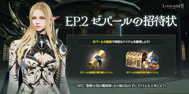 期間中、アリーナ ダンジョン「ゼパールの殿堂」のロビーに、イベントNPC「聖騎士団の魔術師(イベント)」が出現する。「聖騎士団の魔術師(イベント)」からは、「ゼパールの秘密の啓示箱(イベント)」や「ゼパールの殿堂の啓示書(イベント)」をアデナで入手することができる。「ゼパールの秘密の啓示箱(イベント)」からは「啓示の証」「継承者の霊薬/晩餐/聖水(イベント)」のほか、一定確率で「祝福の羽(イベント)」を獲得できる可能性がある。イベントの詳細は、公式サイトのお知らせで確認できる。