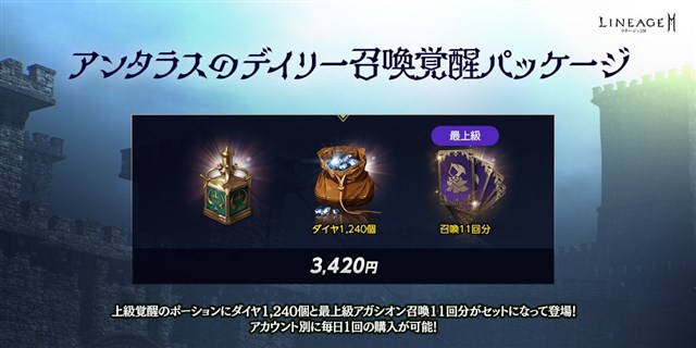 1日1回購入できる「アンタラスのデイリー召喚覚醒パッケージ」が登場した。ダイヤ1240個のほか、「上級覚醒のポーション(刻印)」1個と「業火の最上級アガシオン獲得券II(11回)(刻印)」1個がセットになっている。パッケージの詳細は、公式サイトのお知らせで確認できる。