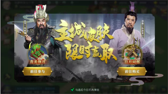 このゲームには中国元で購入できるパックが5種類用意されており、毎日更新される。今作のパック内容は主に有料通貨・各種建設素材・武将招募券の3種類。