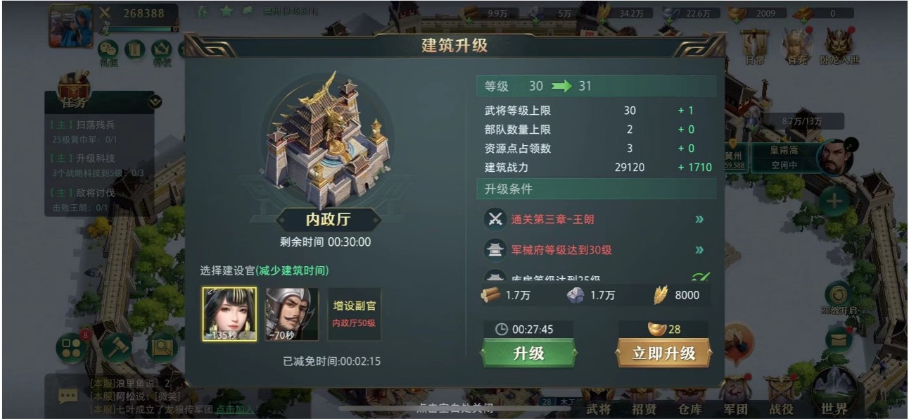 指定のレベルに到達すると、新たな建物と建物外観が解放される。キャラを派遣すると、派遣したキャラに応じて以下の追加効果が発生する。レベルアップに必要な時間の短縮・行軍に必要な時間の短縮・科学技術研究速度の短縮・材料入手量の上昇。