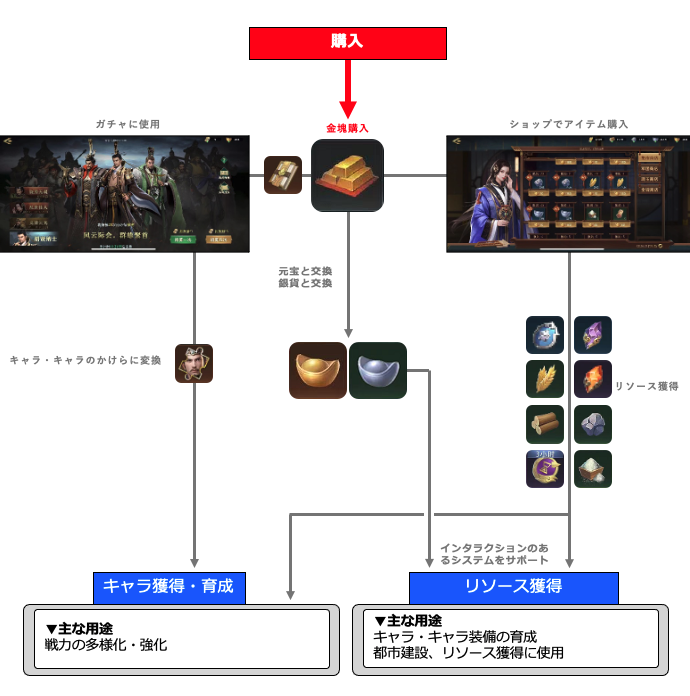 中終盤になると、キャラ育成の需要によりガチャの需要が大幅に高まり、無料の元宝だけでは足りなくなる。主に課金ユーザーに向けたシステムだ。
