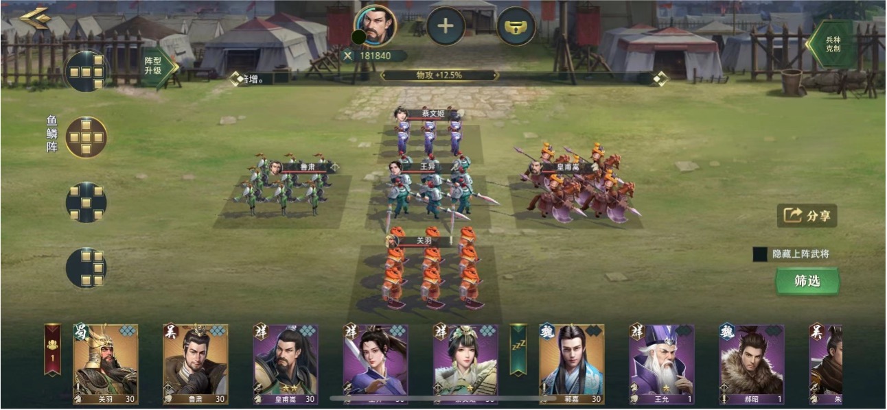 魏・呉・蜀・群の4つの陣営が用意されており、物理攻撃型・戦法攻撃型・策略補助型に分かれている。