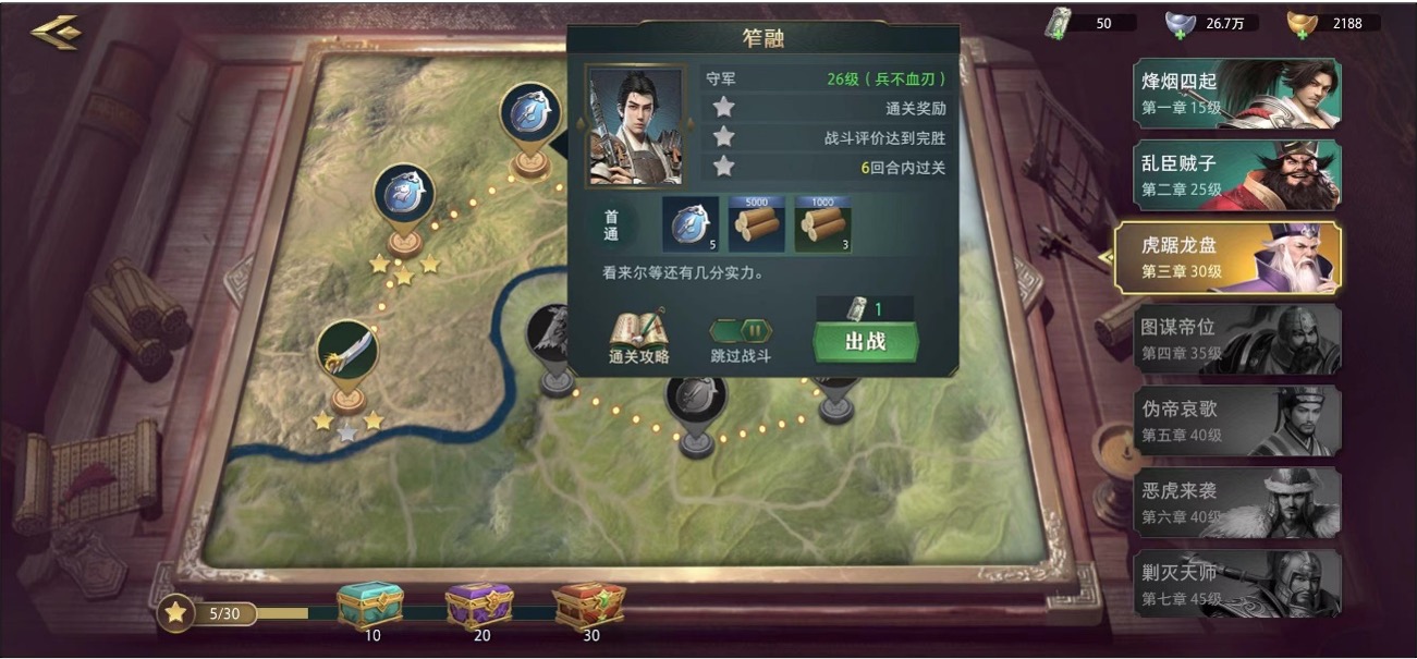 このモードのステージでは、特定の陣容を使わなければならない。プレイヤーの戦略が試される。このモードでは、元宝と各種建築素材が報酬として手に入る。章クリアにより、武将キャラのかけらが手に入る。