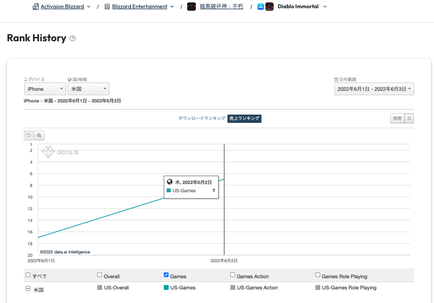 Blizzard Entertainmentが、6月2日に発売したモバイル版「ディアブロ イモータル」が米国で好発進をした。現在App Storeランキングでは、7位まで上昇している。またダウンロードランキングでは首位を維持している。