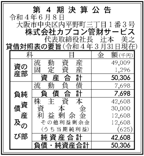 カプコン管財サービスの2022年3月期(第4期)の決算は、最終利益が前の期比で59.4%減の62万5000円だった。前の期(2021年3月期)の実績は、最終利益が153万9000円だった。6月8日付の「官報」に掲載された「決算公告」で判明した。