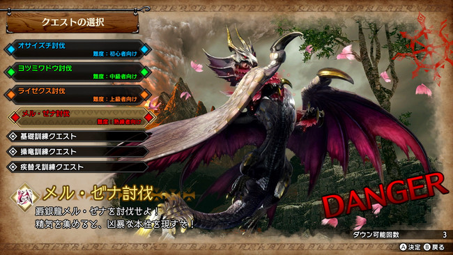 そして熟練者向けには、 体験版用として特別に調整された高難度の「メル・ゼナ討伐クエスト」にも挑むことも可能。