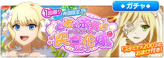 レイドイベント「とある余興の突撃花嫁」開催を記念し、「とある余興の突撃花嫁ガチャ」を上記期間中設置している。