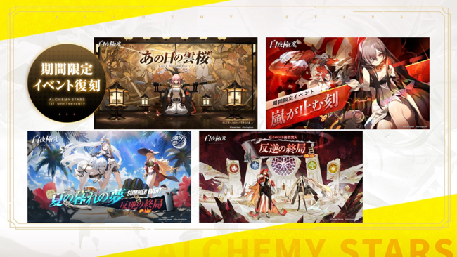 1周年を記念して、 これまでに開催されたイベントから【あの日の雲桜】【嵐が止む刻】【夏の暮れの夢】【反逆の終局】の4ストーリーが復刻予定です! 以前にプレイした方も、 未プレイの方も、 この機会にぜひプレイしてください。