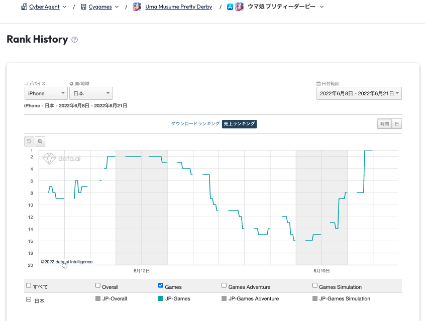 6月21日のApp Storeセールスランキング(ゲームカテゴリー)は、Cygames<4751>の『ウマ娘 プリティーダービー』が首位、2位にガンホー・オンライン・エンターテイメント<3765>の『パズル&ドラゴンズ』、ミクシィ<2121>の『モンスターストライク』が3位という結果になった。