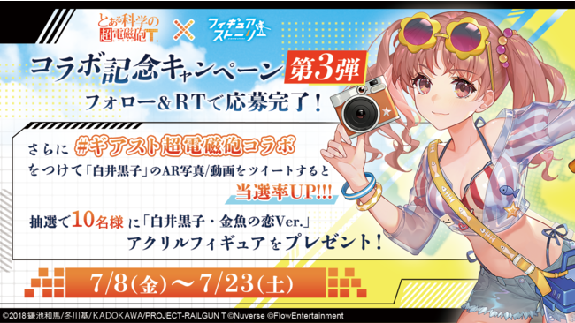 内容:ギアスト公式Twitterアカウントをフォローし、 キャンペーンツイートをRTして応募すると、 第二弾は「御坂美琴・楽しきカエルVer.」、 第三弾は「白井黒子・金魚の恋Ver.」のアクリルフィギュアを各10名に抽選でプレゼント!