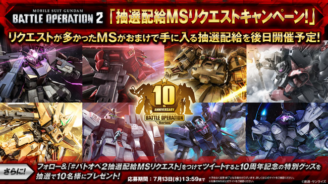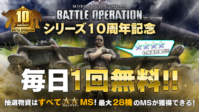『機動戦士ガンダム バトルオペレーション』シリーズの10周年を記念した本キャンペーンは、 毎日1機無料でMSが獲得できる抽選配給の実施など盛りだくさんな内容となっている。
