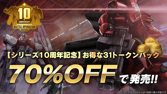 シリーズ10周年を記念して、 PlayStation™Storeにてお得なパックを販売中。 トークン31個が70%OFFで購入できる機動戦士ガンダム バトルオペレーション2 【シリーズ10周年記念】お得な31トークンパックと、 トークン31個に「シャア専用ゲルググ」がおまけでついてくる機動戦士ガンダム バトルオペレーション2 【シリーズ10周年記念】スペシャルパック(シャア専用ゲルググ)の2種類を用意している。 本商品は1つのアカウントにつきそれぞれ1回のみ、誰でも購入可能。