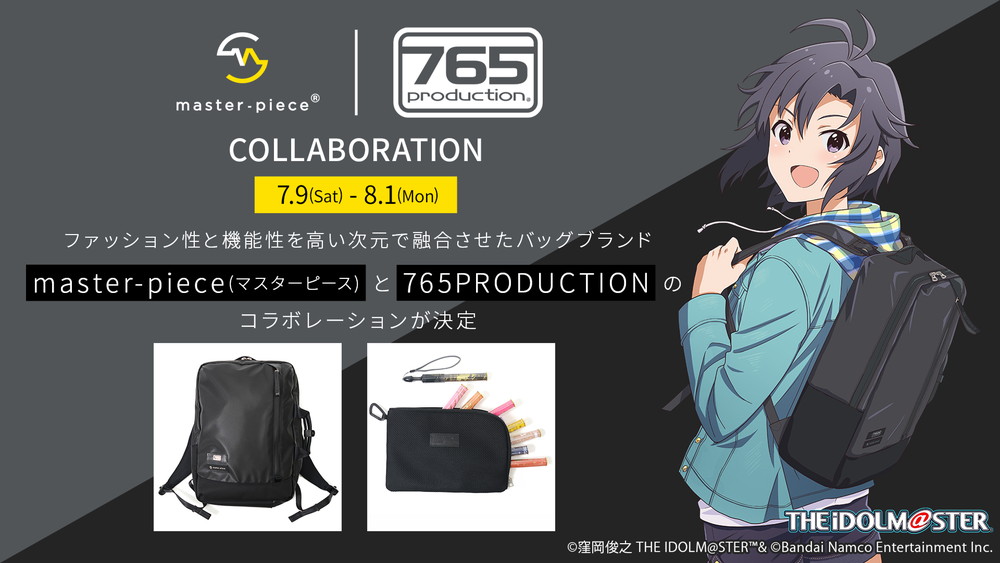 ファッション性と機能性を高い次元で融合させたバッグブランドmaster-piece(マスターピース)と765PRODUCTIONのコラボレーションによる2WAYバックパックが受注開始。「765 PRODUCTION」のロゴや「M@STERPIECE」の歌詞をあしらった特別仕様となる。ペンライトが収納可能な付属のポーチはカラビナを使用してバッグの内装に取り付け固定もできる。グッズセット版にはアクリルスタンド、缶バッジ、アクリルカードが付属する。