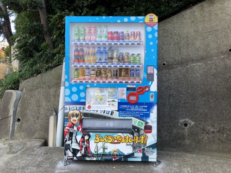 このコラボデザインの自動販売機は、 しまなみ海道自転車通行料金無料化財源への協力として、 売り上げの一部が寄付される。