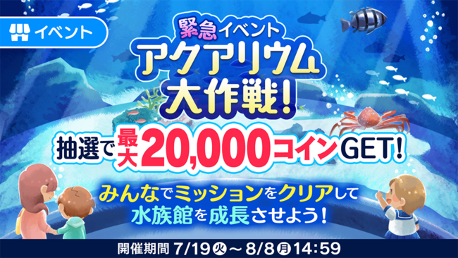 ユーザー全員で水族館を成長させるイベント。ミッションをクリアすると魚をゲット、 捕まえた魚の数によって水族館はどんどん大きくなり、 報酬も豪華になっていく。 最大で20,000コインが抽選で5名に当たる。