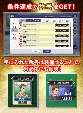 『MJ』をプレイすることで達成できる実績機能が追加され、 称号が獲得できるようになりました。手に入れた称号は、 メニュー画面の「データ」から「称号」を選び、 任意の称号を選択、 決定することで装備することができ、 対局中にも反映されます。