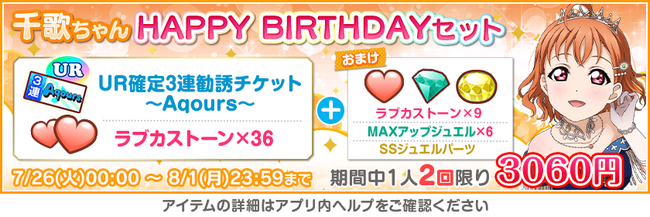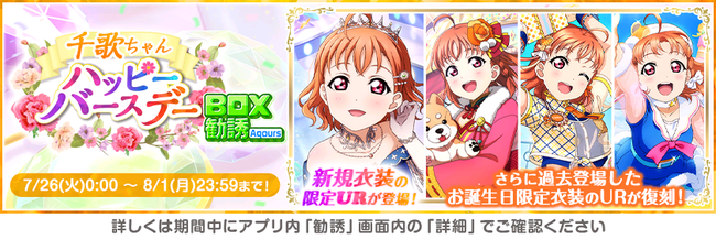 ブシロード<7803>は、『ラブライブ!スクールアイドルフェスティバル』(以下、 スクフェス) において、Aqours高海千歌誕生日記念キャンペーンの開催を発表した。
