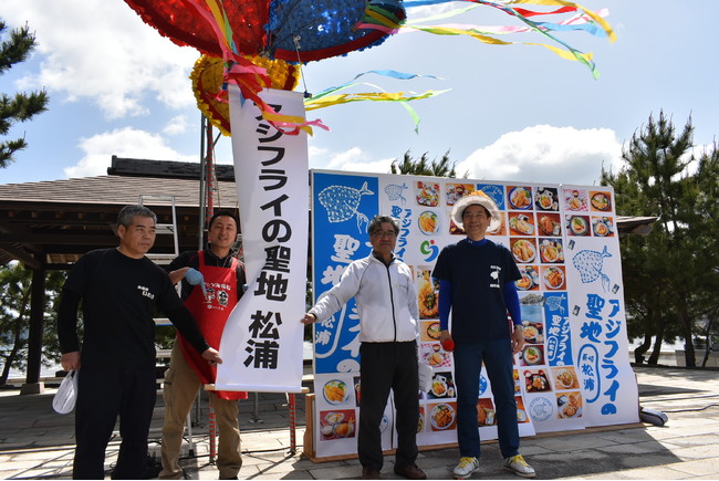 永田氏からは「この度は松浦アジフライ大使の就任おめでとうございます。 松浦アジフライマップ表紙のセリ人として、 大変嬉しく思います。 これから「アジフライの聖地 松浦」を、 一緒に盛り上げていけたらと思います。 」とそれぞれがコメント。 最後に「アジフライを日本中に!!世界中に!! アジフライ・フライ(FLY)!!」と友田市長が参加者へ合言葉として呼びかけた。