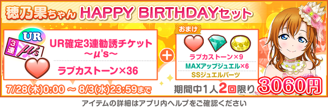 ブシロード<7803>は、『ラブライブ!スクールアイドルフェスティバル』(以下、 スクフェス) において、μ’s高坂穂乃果誕生日記念キャンペーンの開催を発表した。