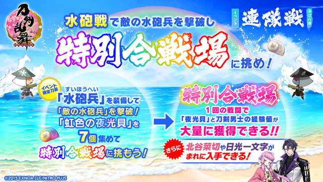 「連隊戦 ~海辺の陣~」の報酬として、 集めた「夜光貝」の数に応じて、 新刀剣男士「笹貫(cv. 高橋広樹)」に加え、 刀剣男士「浦島虎徹(cv. 福島潤)」「北谷菜切(cv. 仲村宗悟)」「千代金丸(cv. 新垣樽助)」も入手できる。