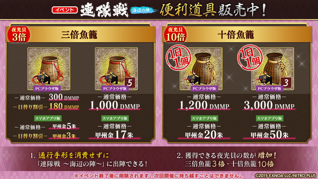 ※「十倍魚籠」「三倍魚籠」「兵糧丸」「采配」「御札・水砲」は、 イベント「連隊戦 ~海辺の陣~」専用便利道具です。イベント終了後、 未使用分は使用不可となり、 所持道具一覧からも削除されますので、 ご注意ください。