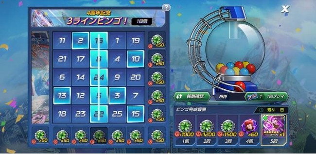 くじ引きマシーンで出た数字によって縦・横・斜めのいずれか5マスを揃えてビンゴを完成させると、 新ファイターのバトルカードなどの報酬を獲得することができます。