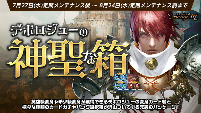 対応した職業の一般~英雄級のスキルカードが獲得できる「スキルカードガチャパック箱(イベント)」や、 変身かマジックドールを選んで獲得できる「最上級カードガチャパック選択箱」、 爵位システムに利用可能な「上級祝福の粉箱」と「名誉コイン箱」がセットになった「夏の箱パッケージ」が登場しました。