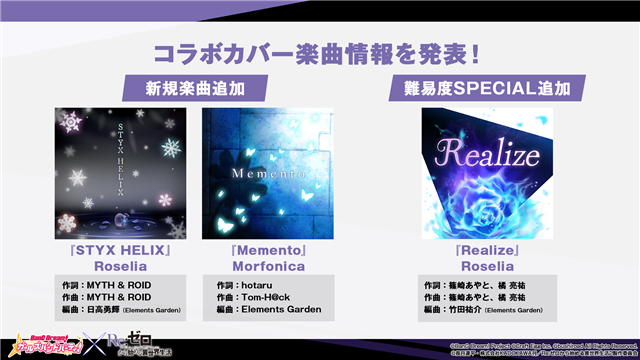 コラボレーション企画第2弾の開催を記念して、既存カバー楽曲『Realize』の難易度「SPECIAL」を追加する。また、新たなコラボカバー楽曲として、Roseliaが歌う『STYX HELIX』(作詞:MYTH & ROID・作曲:MYTH & ROID・編曲: 日高勇輝(Elements Garden))と、Morfonica が歌う『Memento』(作詞:hotaru・作曲: Tom-H@ck・編曲: Elements Garden)を、8月20日15時より追加することが決定した。