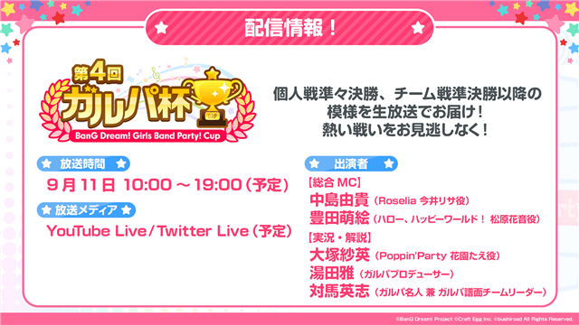 第4回ガルパ杯の本戦を、9月11日10時より開催することが決定した。また、本戦の様子は YouTube「バンドリちゃんねる☆」とガルパ公式Twitter(@bang_dream_gbp)のTwitter Liveにて生放送を予定している。大会の詳しいルールやエントリー方法、課題曲については、「第4回ガルパ杯」大会公式サイトで確認できる。